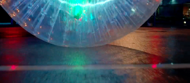 They are called Zorbs! Director Christian Lyngbye flew in from Denmark to roll them down the streets of Vancouver. Do not try this without professional supervision!